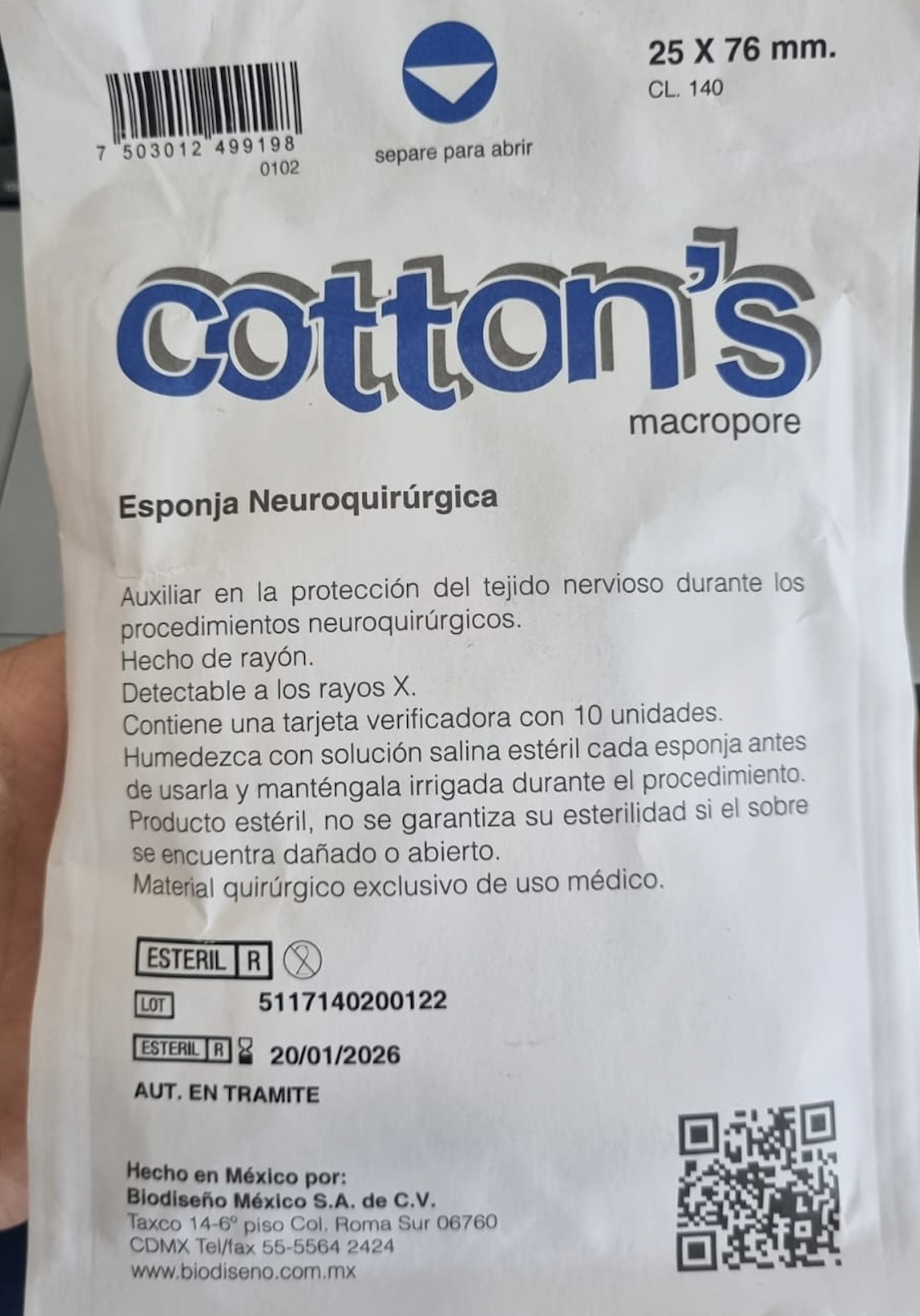 Producto utilizado en cirugías del sistema nervioso central y de columna su propósito es la absorción y extracción de la sangre y de otros fluidos de la zona operada.